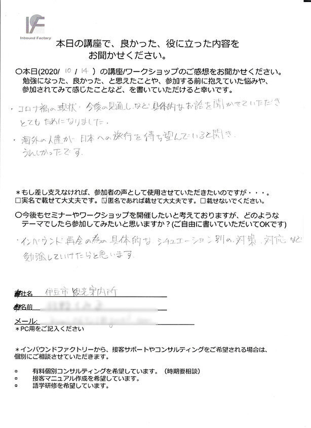 2022.06.01 お客様の声 修善寺温泉で行われた講座の感想が届きました。5 セミナー・ワークショップの感想をお聞かせください。 ・コロナ禍の現状、今後の見通しなど具体的なお話を聞かせていただき、とてもためになりました。 ・海外の人達が日本への旅行を待ち望んでいると聞き、嬉しかったです。 今後受けてみたいセミナー・ワークショップを教えてください。 インバウンド再開のための具体的なシチュエーション別の対策・対応など勉強していけたらと思います。